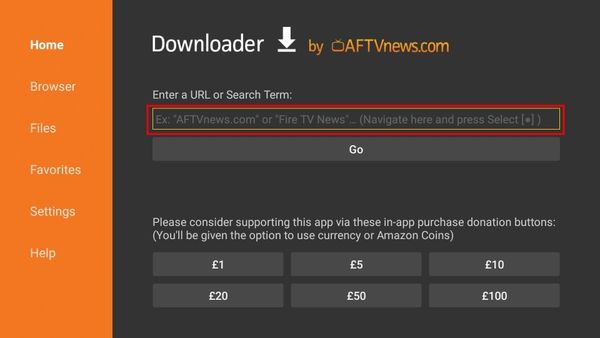 Now open “Downloader” application. Once you opened it, you will see a place to enter web address. In order to use browsing feature we have to install browser plugin. Enter below address and press “GO” or “enter” to download browser plugin for TV.